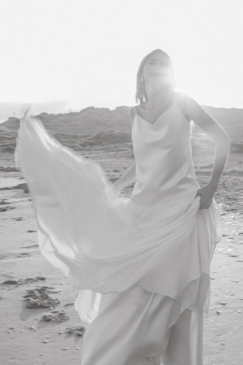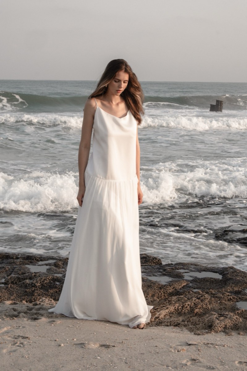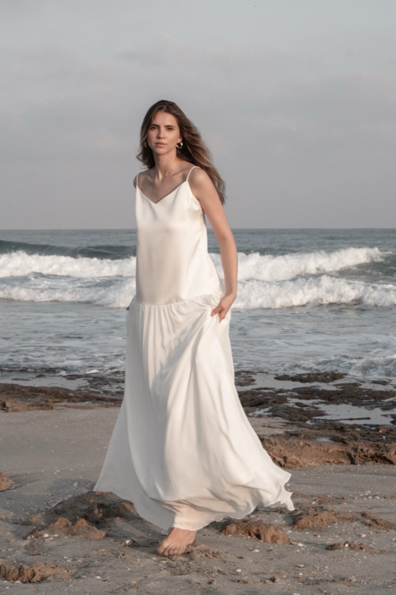 מחשוף מרובע, גזרה זורמת. בד סאטן שנע עם הגוף — לא מתנגד לו.