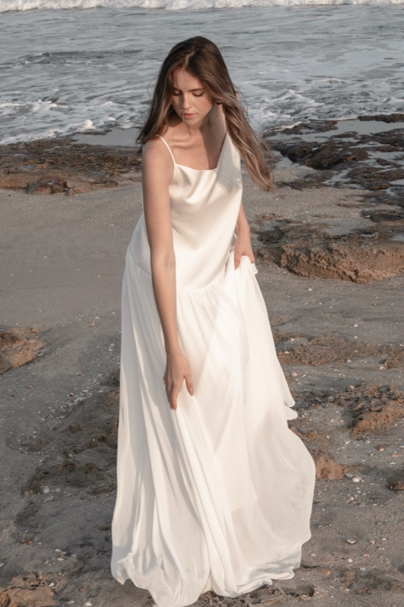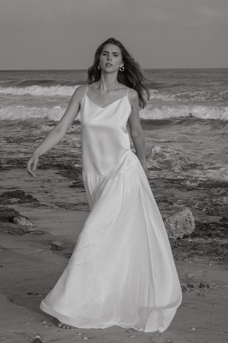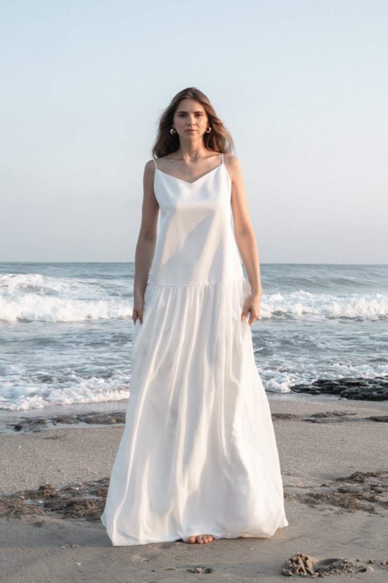 מחשוף מרובע, גזרה זורמת. בד סאטן שנע עם הגוף — לא מתנגד לו.